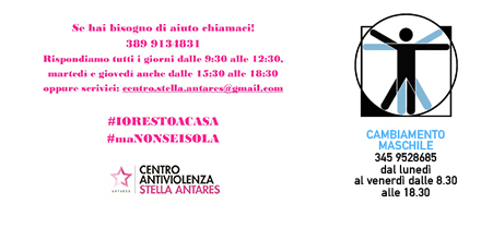 Si informa che, in questi giorni di sospensione delle attività pubbliche, in ottemperanza a quanto stabilito dal DPCM 11 marzo 2020, sia il Centro Antiviolenza Antares che “Cambiamento Maschile” – Spazio di ascolto per uomini che agiscono violenza nelle relazioni affettive continueranno a fornire il servizio in maniera telefonica.