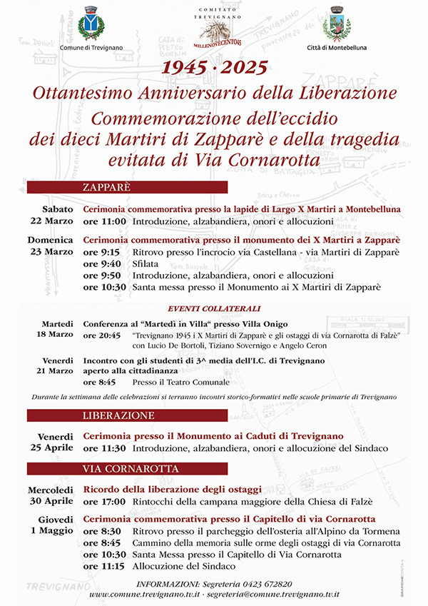 Le Amministrazioni dei Comuni di Trevignano e di Montebelluna commemorano l’80° anniversario dell’eccidio dei dieci Martiri di Zapparè, avvenuto il 22 marzo del 1945, con un programma di celebrazioni ed eventi.