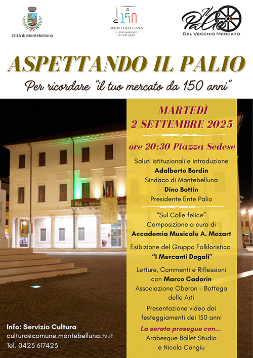 Commenta il sindaco Adalberto Bordin: “Abbiamo voluto far coincidere l’apertura di un evento amato come il Palio del Vecchio Mercato con un evento che potesse in un certo senso concludere le celebrazioni del 150mo anniversario della nascita della Città di Montebelluna.