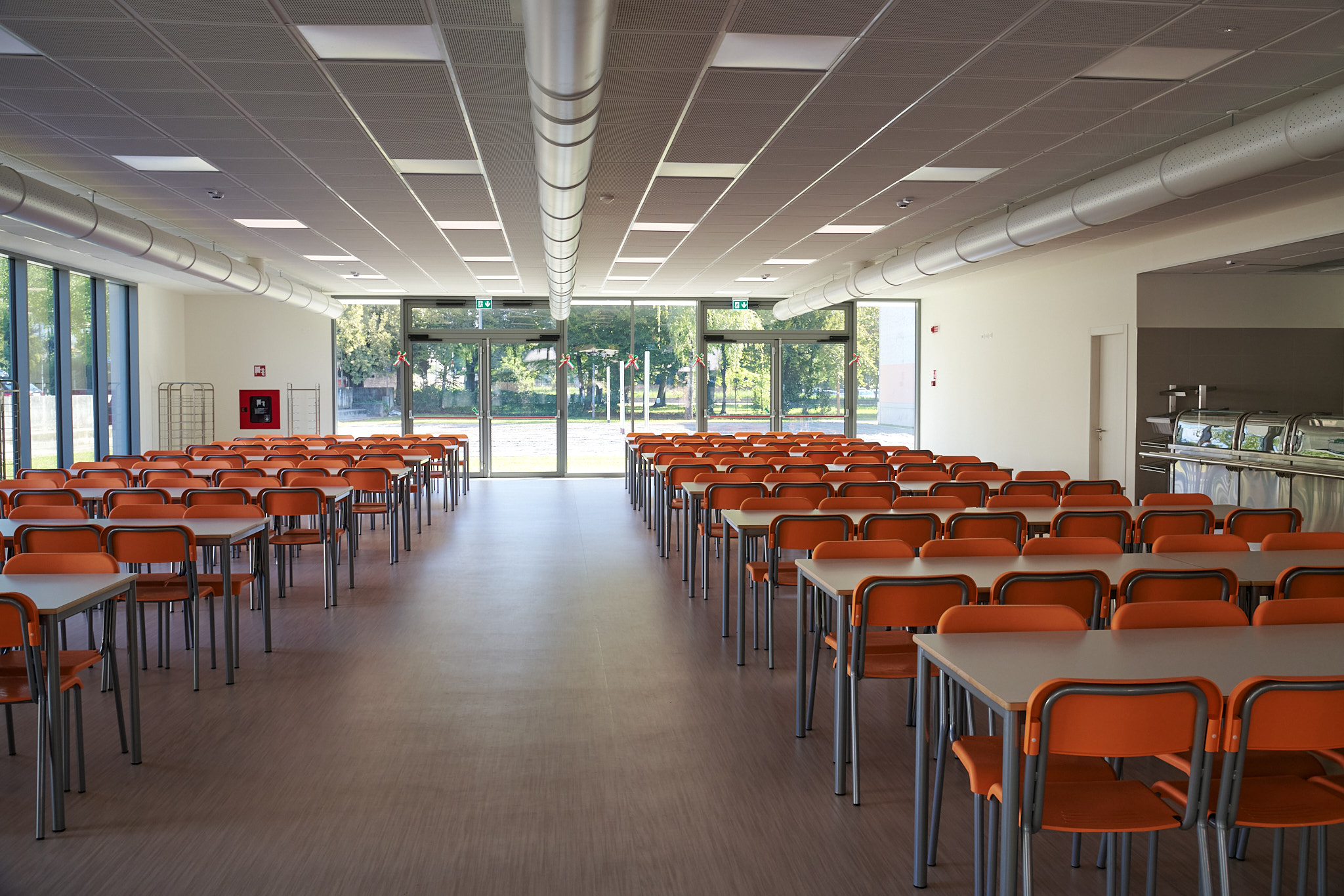 Il refettorio sorge nella parte nord del plesso scolastico, in un’area che è stata completamente riqualificata. All’interno si apre una sala mensa luminosa, resa ariosa dalle grandi vetrate, che garantisce un ambiente confortevole grazie a un efficace isolamento termico e acustico. A completare la struttura vi è un’area di distribuzione pasti attrezzata con tecnologie moderne per garantire efficienza e igiene, oltre a servizi igienici e vani tecnici. È stato inoltre predisposto un corridoio che in futuro permetterà di collegare direttamente la mensa con l’atrio della scuola, nell’ottica di una riqualificazione più ampia già programmata.