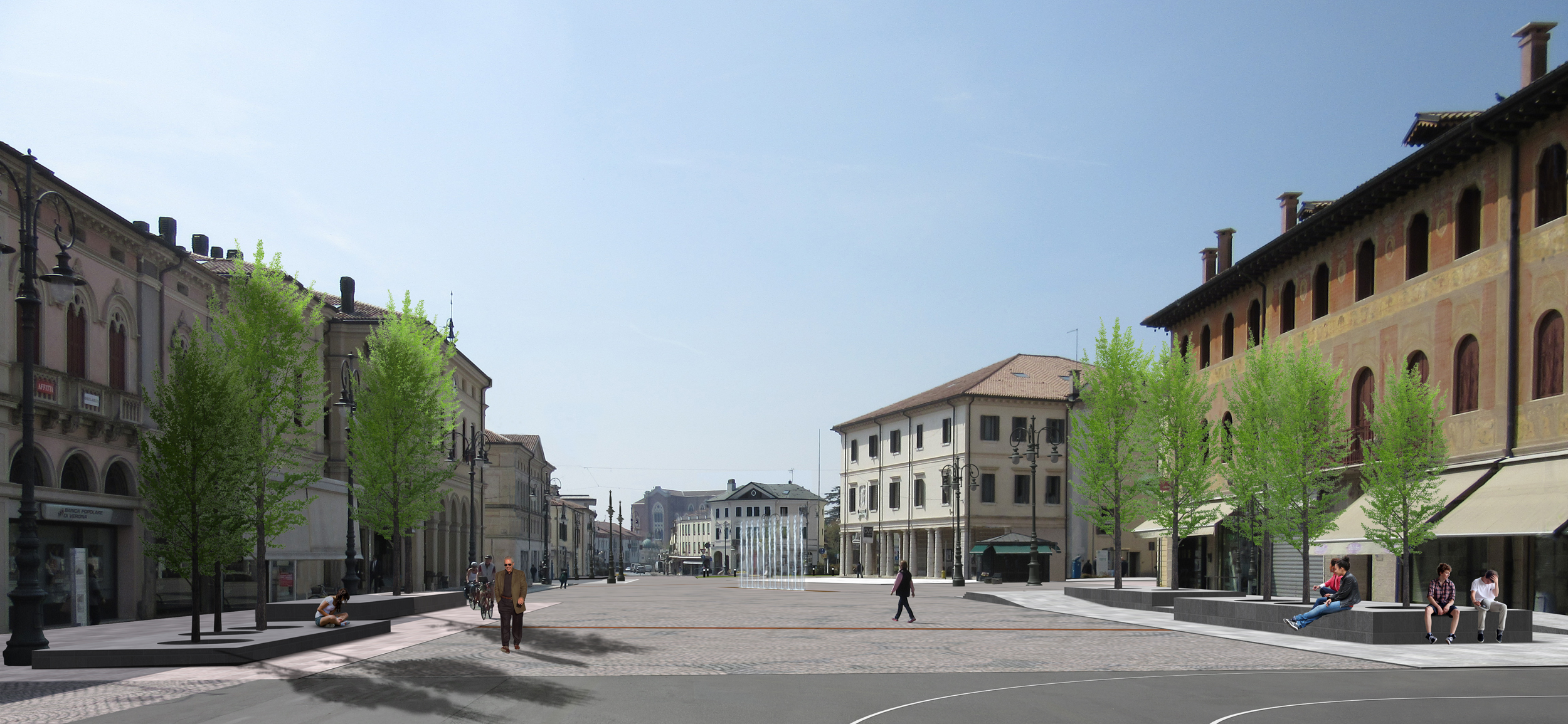 L’intervento di maggior impatto e significato attiene la pedonalizzazione della parte centrale del corso Mazzini, cui si aggiunge la pedonalizzazione dell'area circostante il monumento ai caduti e di parte della Piazza Monnet. Si ricompone così quell'insieme che, ad inizio Novecento, era formato dal binomio piazza Garibali/piazza Teatro. È in questo ambito che si trovano i palazzi storici più significativi della città, la cui importanza nella scelta progettuale trova riconoscimento attraverso l'apposizione per ciascuno di essi di un crepidoma, ovvero di un tappeto marmoreo, in analogia a quanto già avvenuto per la Loggia. Le isole degli edifici trovano collegamento attraverso un tessuto connettivo in pavé, utile a conservare la carrabilità per i mezzi del mercato. Il disegno a terra è ad anelli di diverse dimensioni, solcato da alcune linee di forza che rispondono ad esigenze insieme estetiche e funzionali: impluvi delle acque e servizi tecnologici per gli eventi culturali. Nella parte centrale fra Loggia e Veneto Banca si elevano i getti di una fontana a scomparsa.