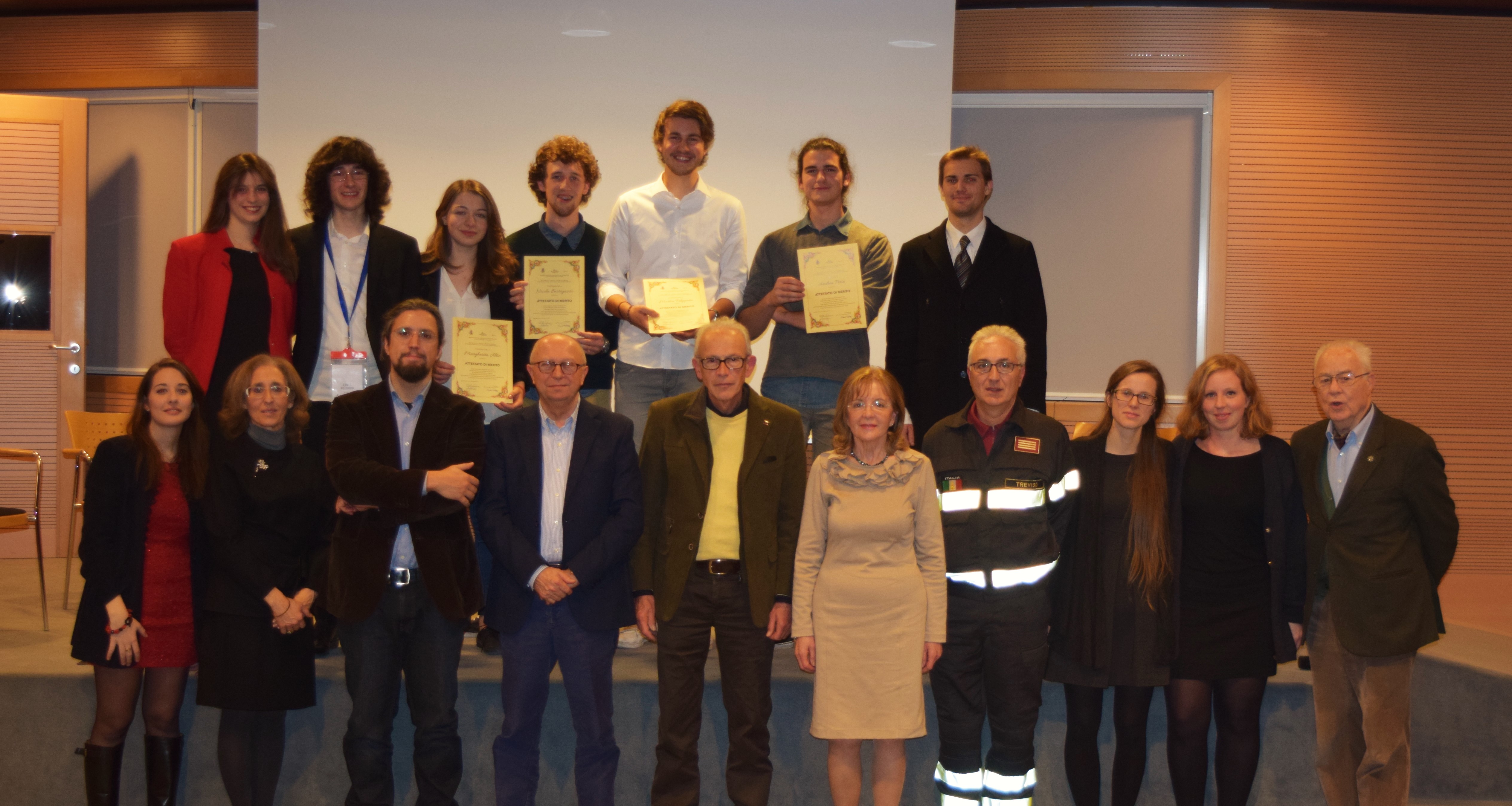 In basso da sinistra: Sara Carlino (direttivo Levi Alumni), Nicoletta Padovan (direttivo Levi Alumni), Paolo Malaguti (scrittore, ospite d'onore), Elzo Severin (vicesindaco Montebelluna), Francesco Adami (presidente Lions Club Montebelluna), Gianna Marisa Miola (ex-Vice Direttrice Generale dell'Ufficio Scolastico Regionale per il Veneto), Walter Salvadori (Comandante stazione Vigili del fuoco di Montebelluna), Chiara Semenzin (direttivo Levi Alumni), Serena Pozzebon (direttivo Levi Alumni), Luciano Masiero (Circolo Culturale "Pietro Bertolini").